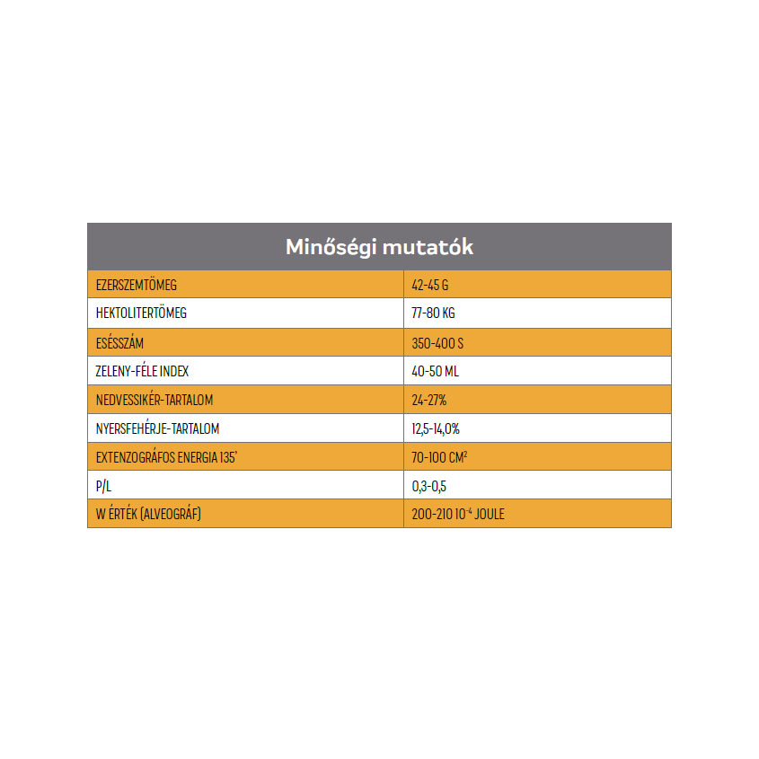 Intenzív termesztési körülmények között kiemelkedő terméseredményekre képes, jó szárszilárdságú, megdőlésre nem hajlamos őszi búza.. Elsősorban azoknak a termelőknek ajánljuk, akik a mennyiségre helyezik a hangsúlyt.